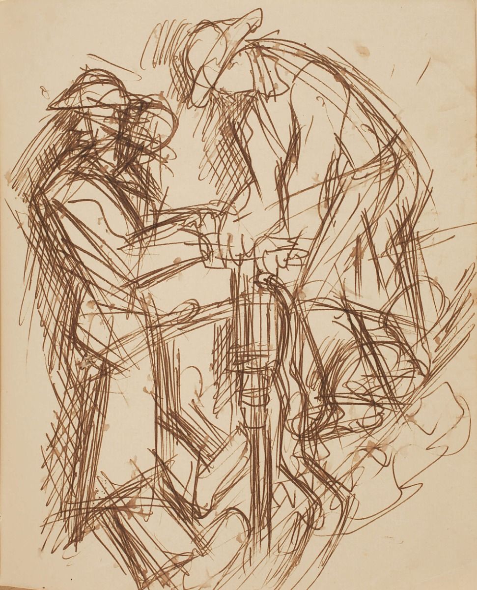 Ramkinkar Baij Untitled (Stone Quarrying and Studies for Yaksha-Yakshi) year 1956-58 size 7.5 x 6.2 in. / 9.1 x 15.7 cm. medium Pen and ink on paper |