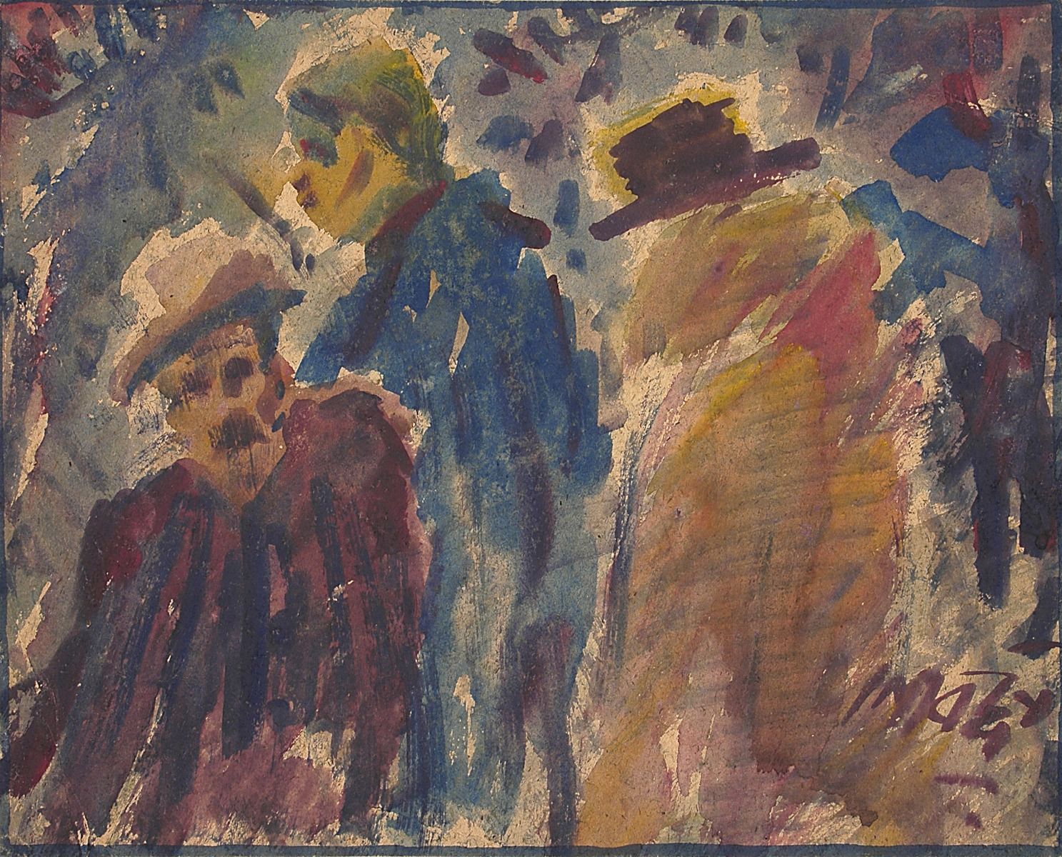 This watercolour by Gobardhan Ash is markedly different from the images of devastation—caused by the 1943 Bengal famine—that he is most well-known for. A modernist work, it appears to be a snapshot of an autumnal street somewhere in the western world given the long coats and hats of the three men in the painting. The colour scheme too is more temperate than tropical. The most arresting quality of the work are the impressionistic brushstrokes that define the figures as well as the busy landscape behind them, successfully capturing the afternoon light of the scene.