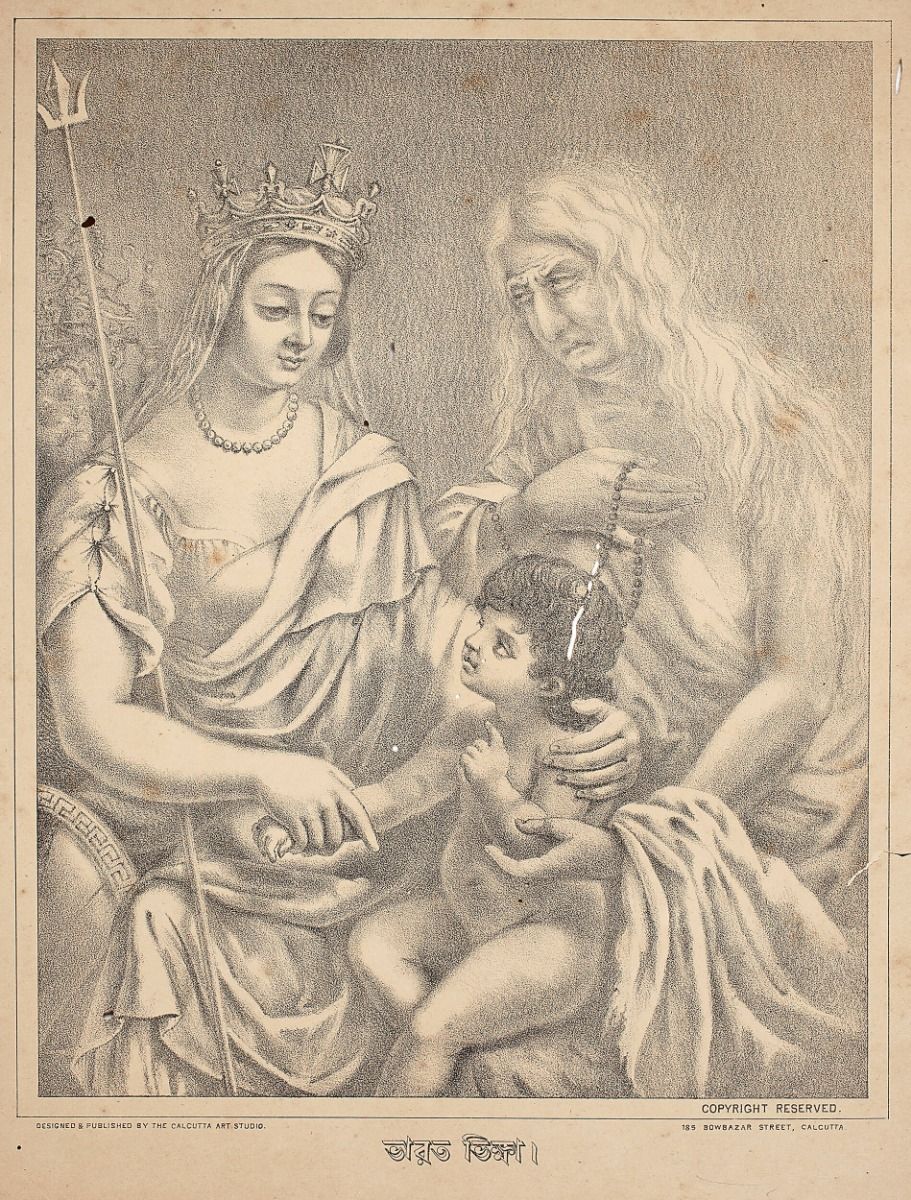A highly controversial lithograph, Bharat Bhiksha (India begging) represented the British notion of their civilising race’s beneficence to a subservient nation like India. The image brings together three figures, symbolically standing in for three generations, positioned according to age. The old lady hands over the responsibility for the child to a youthful, resplendently attired woman. Politically, the old woman, as well as the child, represent India and the youthful woman is Britain, her youth signalling how British patronage over an ancient, exhausted country would provide for a bountiful future.