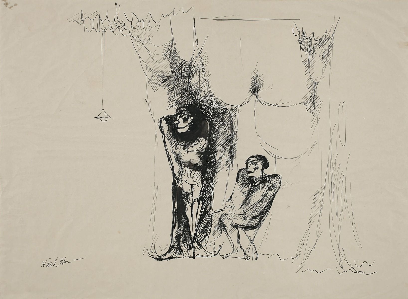 Nikhil Biswas was a founding member of the Society of Contemporary Artists, Calcutta (now Kolkata) along with others like Somnath Hore, and firmly believed in the power of collective art. Struggling with financial difficulties, he used the cheapest material to execute his art—packaging paper, newsprint, and a viscous ink pen. In this disquieting pen and ink drawing, we see two figures waiting near the curtains of a stage. A singular lamp hangs above them—one of the figures is dressed like a medieval jester, though his face has a menacing, skull-like quality.