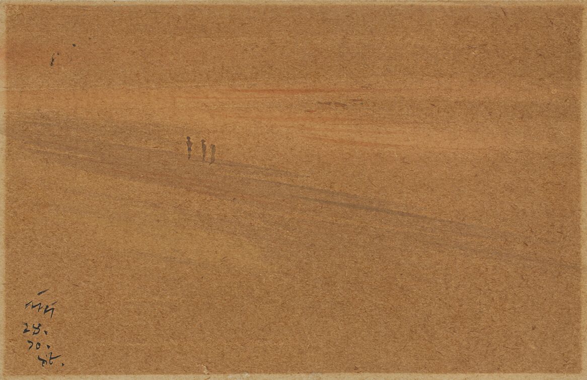 Nandalal Bose is one of the most significant Indian artists from the twentieth century, associated with the contextual modernism that was developed in Santiniketan, Bengal, where Rabindranath Tagore had established a university. Nature came to be a strong draw for Bose once he relocated to head the art department in Santiniketan, and it formed an overwhelming majority of his subjects. The equanimity it posed to him is strongly realised in his landscapes, seen to great effect in his postcards where he captured vast expanses of land or hilly terrain in the small pictorial area with consummate skill. The pre-dominant influence for such works were Chinese and Far Eastern art and Indian miniatures. He eschewed the washes for short, quick brushstrokes that seemed to suggest the artist’s choice of subject rather than rendering it realistically. In instances such as these, Bose indicates the landscape but leaves it to the viewer to grasp its vastness as well as the blustery wind and the travellers seeking a sanctuary from it.