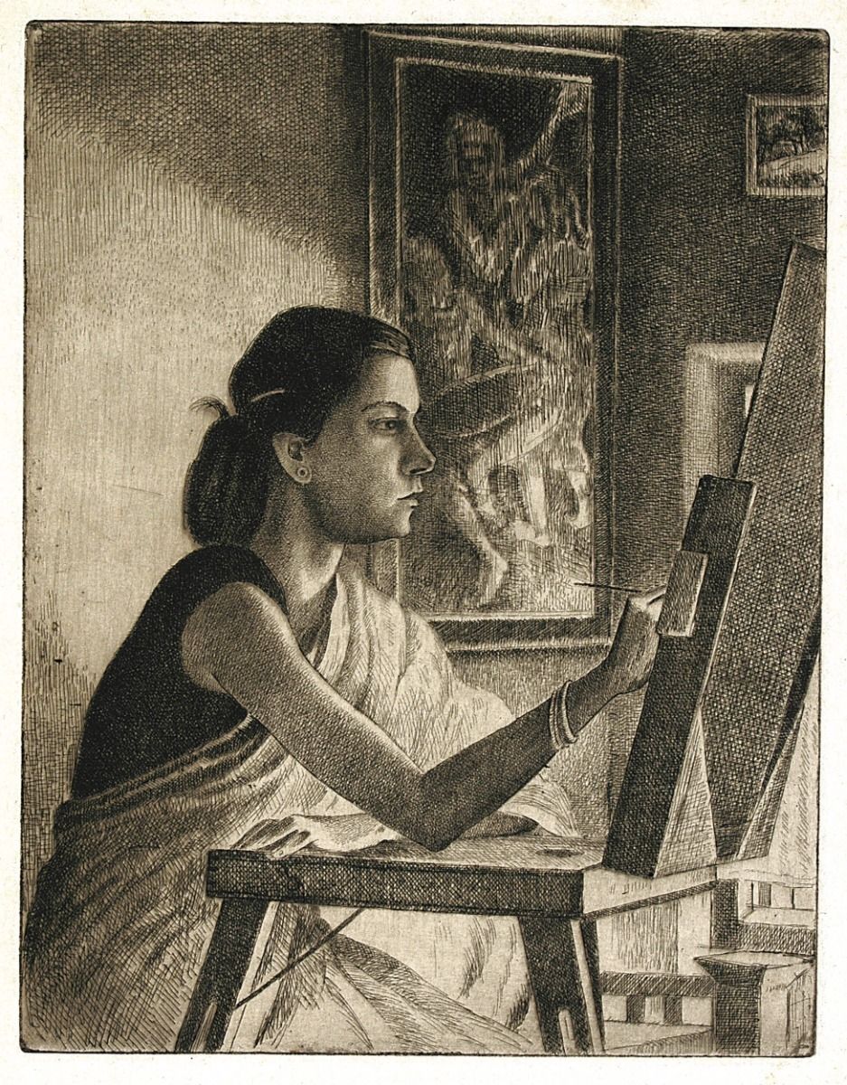 Ramendranath Chakravorty was trained in etching, aquatint and drypoint from the famous printmaker Muirhead Bone, known for his work as a war artist in both the First and the Second World Wars. In 1943, he became the Principal at the Government School of Art, Calcutta and introduced graphic art into the curriculum of the school. Chakravorty’s prints display a confluence of artistic traditions—from the Santiniketan School, especially the woodcut prints of Nandalal Bose, and European idioms like pointillism and Impressionism. In this image, we see an artist at her studio. A shaft of light falls from behind her, onto the canvas, as she raises her hand to paint. Her slightly unfocused eyes create a pensive mood, as if she has been captured during an absent-minded moment.