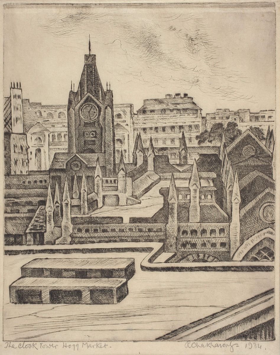 Ramendranath Chakravorty The clock tower Hogg Market year 1934 size 11.0 x 8.9 in. / 27.9 x 22.6 cm. medium Etching on paper |
