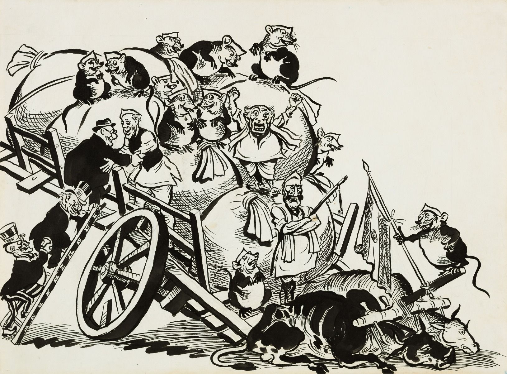 Chittaprosad is one of the most important Indian artists of the twentieth century. He is best known for his documentation of the 1943 Bengal famine—one of the worst man-made disasters in history that killed millions in India during the Second World War, while India was still under British colonial rule. Caricatures and the satirical mode were regularly employed by Chittaprosad. In this image, he depicts the easy manner in which Indian leaders colluded with imperialist powers to crush their own economy during the Second World War when famine had already reduced the land to impoverishment. He takes recourse to animal imagery to communicate the essence of each human participant and their impact on reality.