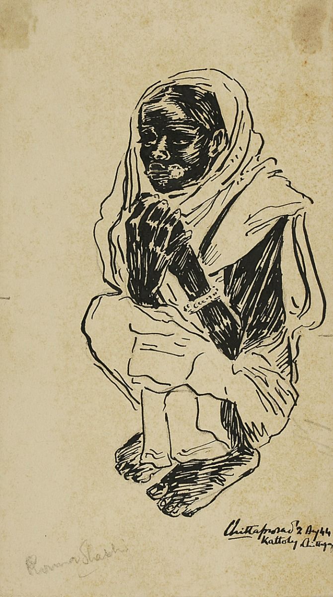 The Bengal Famine of 1943-44 was a man-made disaster that caused the deaths of millions of Indians who resided in the eastern regions of the country, especially in Bengal and what is today Bangladesh. Chittaprosad—one of India’s most important artists and a committed member of the Communist Party of India- was known for his records of pivotal political and social upheavals in the country. He travelled to the famine-stricken regions and made heart-rending sketches and drawings of the people’s conditions. The desolation caused by the famine was not only physical sickness and death, but exhaustive psychological trauma amongst the survivors. In this work, Purna Shashi, a female figure can be seen sitting hunched over and bearing visible marks of starvation. The artist portrays her trauma through her solemn, almost hazed expression. Dated to mid-1944, this picture is from a period when the food shortage had ended but diseases such as malaria continued to thrive. Chittaprosad made many such sketches, some of which were published by the Communist Party of India in their magazine, the People’s War, and some others were published by the artist in 1943 in a book titled Hungry Bengal. The book, however, was seized and burnt by the British who were still the colonial rulers of India. Only one copy survived, and it is now a part of the DAG collection.