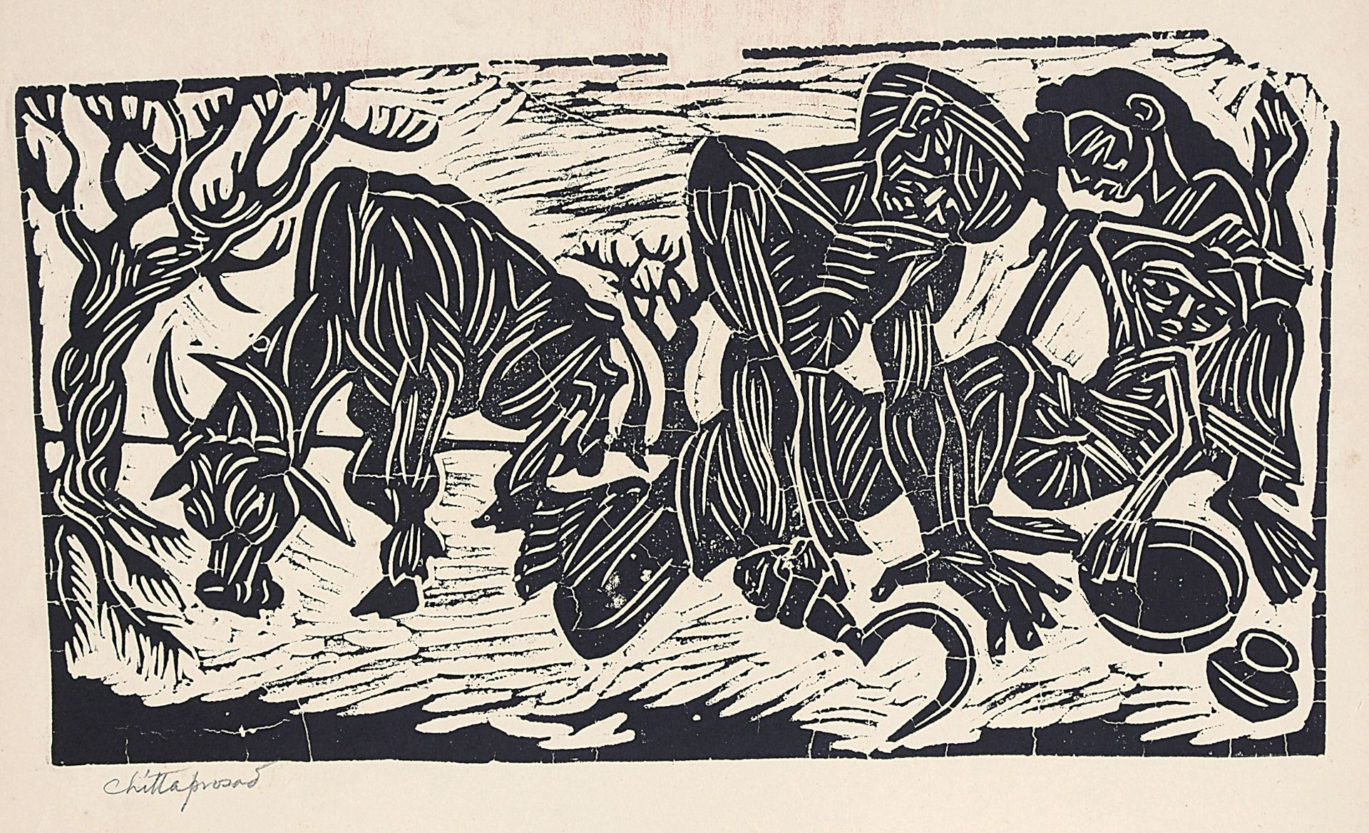 Chittaprosad is one of the most important Indian artists of the twentieth century. He is best known for his documentation of the 1943 Bengal famine, which was one of the worst man-made disasters in history that killed millions in India during the Second World War, while the country was still under British colonial rule. A committed member of the Communist Party of India, Chittaprosad’s art also protested against colonialism, economic exploitation, urban poverty and depravity. This Untitled lino-print by him may not be a depiction of the 1943 famine, but a general reaction to worldly suffering that affects all forms of life. In the image, we see dead trees, along with starving cattle and farming families, all of whom are debilitated by drought.
