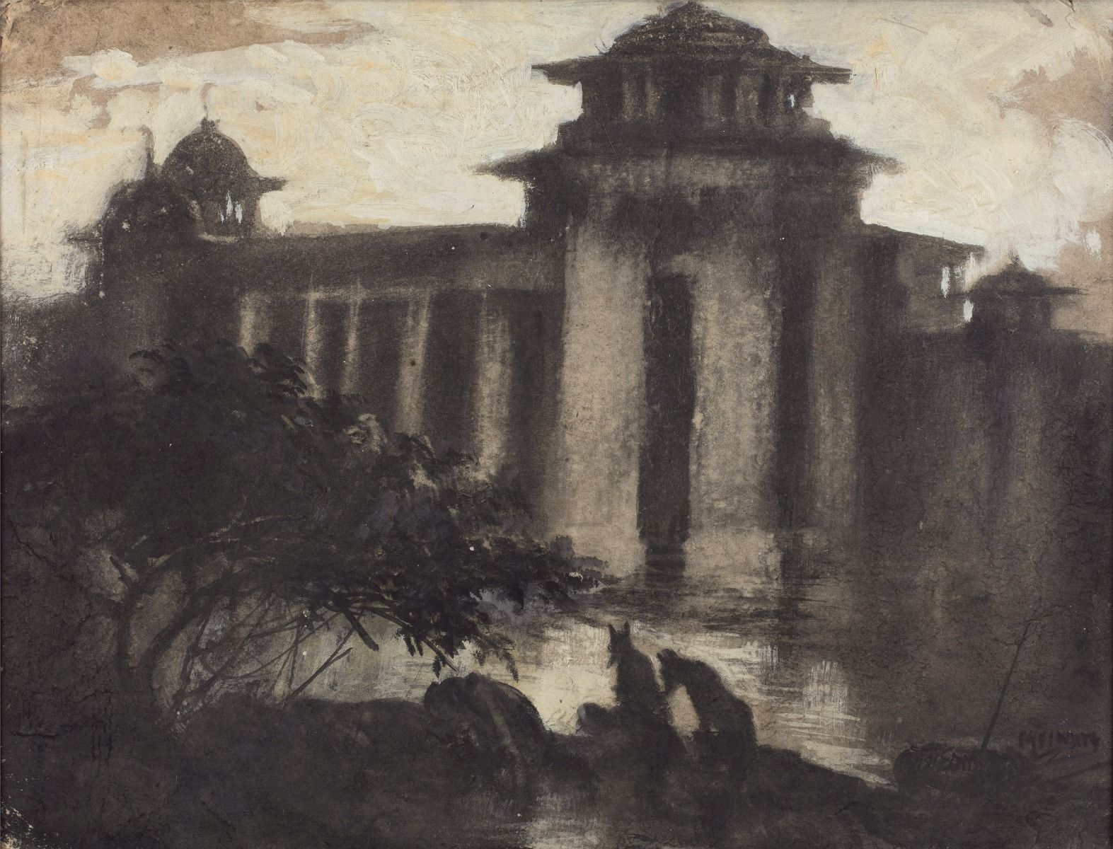 Devi Prasad Roy Choudhury is one of the most well-known Indian sculptors of the twentieth century. He was also a painter, writer, teacher and institution-builder, closely associated with many late-colonial and postcolonial art academies, including the government art school in Madras (now Chennai) and the Lalit Kala Akademi. He learnt from Abanindranath Tagore—a pioneering twentieth-century Indian artist and active proponent of nationalist revivalist art, who was the founder of what came to be known as the Bengal School—as well as European teachers, leading him to develop a unique synthesis between deliberate orientalist styles and western, realist idioms. In this delicate gouache and ink work on paper, he demonstrates his easy mastery of a poetic realism that could be employed to depict dream-like spaces in states of decline, like this country seat that appears to be on the verge of being re-claimed by its natural surroundings.