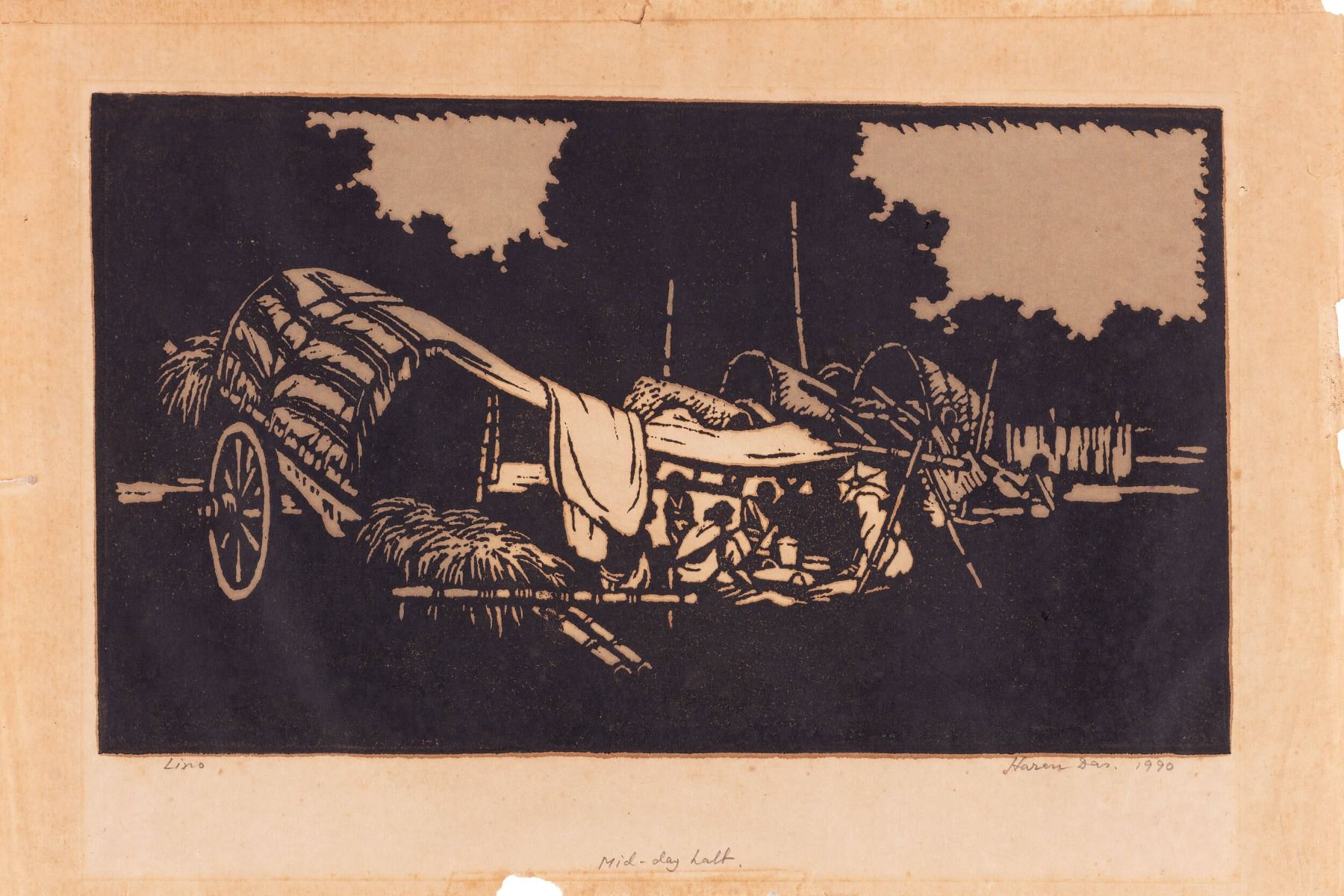 Haren Das was a prominent printmaker and master of academic naturalism, and unlike his contemporaries who were moving away from realism, he remained faithful to this style throughout his artistic career. Having grown up in a farming community in East Dinajpur (in present day Bangladesh), Das extensively documented rural men and women at work. The abundance and variety of such images hark back to the rhythms of work and leisure that was a part of his childhood. This linocut captures an hour of rest—men and women take shelter under the makeshift shed created out of two bullock-carts carrying bales of hay.