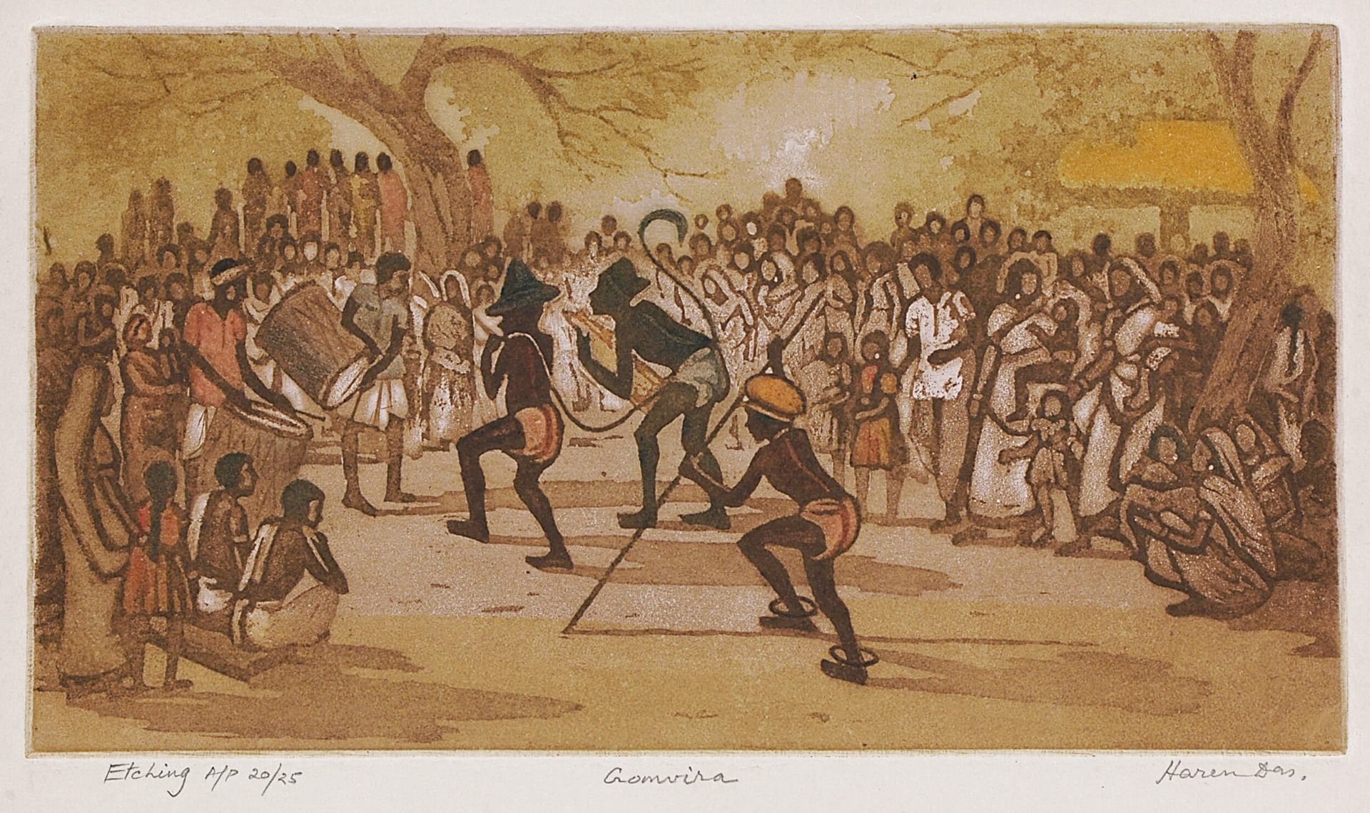 Haren Das was a prominent printmaker and master of academic naturalism, and unlike his contemporaries who were moving away from realism, he remained faithful to this style throughout his artistic career. Having grown up in a farming community in East Dinajpur (in present day Bangladesh), Das extensively documented the pattern of life in the villages of Bengal. This aquatint depicts a Gomvira pala—a traditional didactic performance where two people assume the role of a grandfather and grandson and perform songs in the form of an intergenerational dialogue to raise awareness about a specific social issue.
