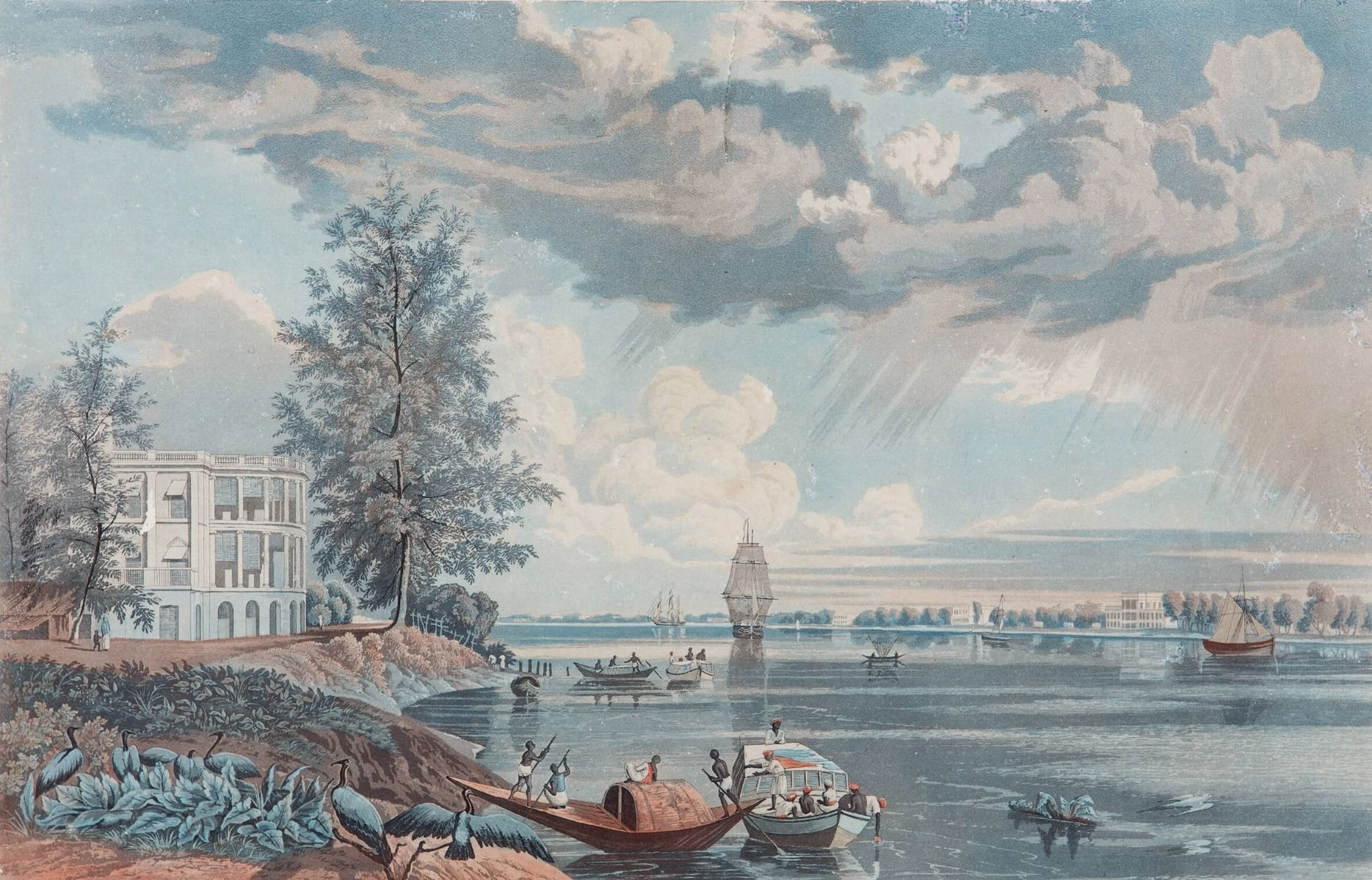 James Baillie Fraser A View of Botanic Garden House and Reach size 13.0 x 17.7 in. / 33.0 x 45.0 cm. medium Handtinted engraving on paper |
