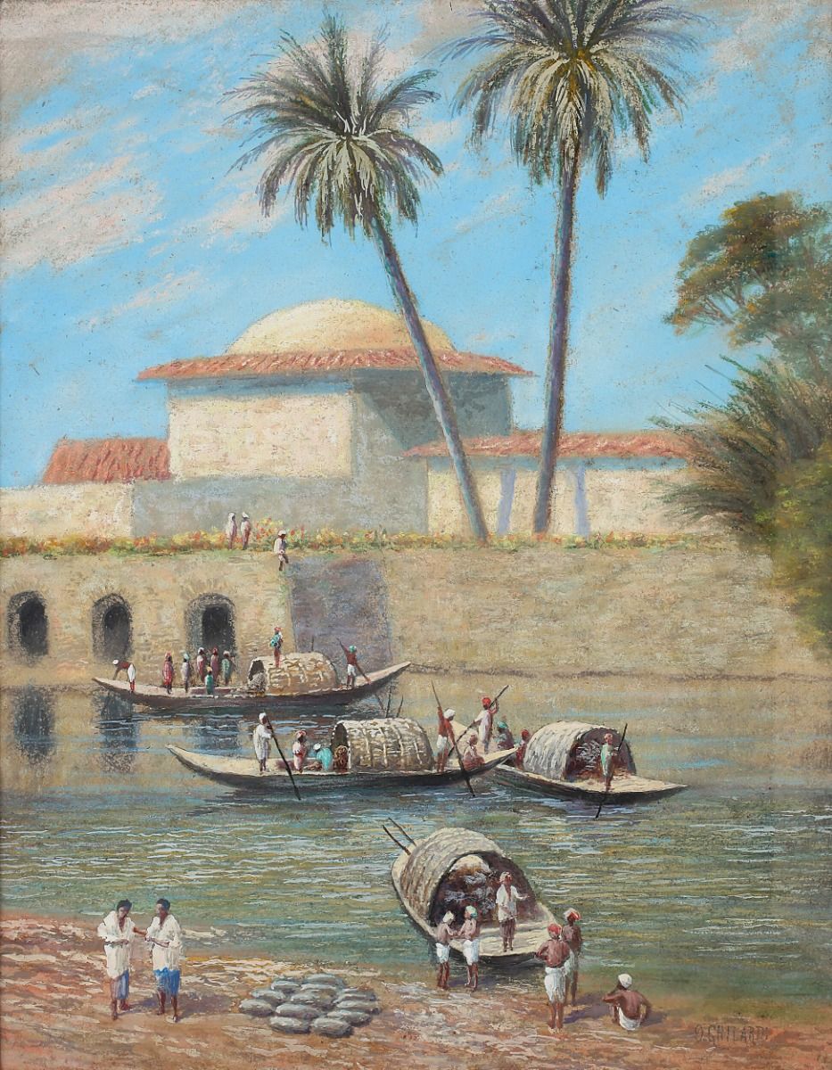 Born in Italy, Olinto Ghilardi contributed significantly towards shaping the course of the Indian art movement in the late nineteenth century. Introducing European art techniques to Calcutta (now Kolkata), Ghilardi played a vital role as Abanindranath Tagore’s mentor, while also carrying representative views of India to European countries. In this picturesque view of a riverside scene on a clear day in Bengal, the building imposes its presence over the boats and human activity on the river.