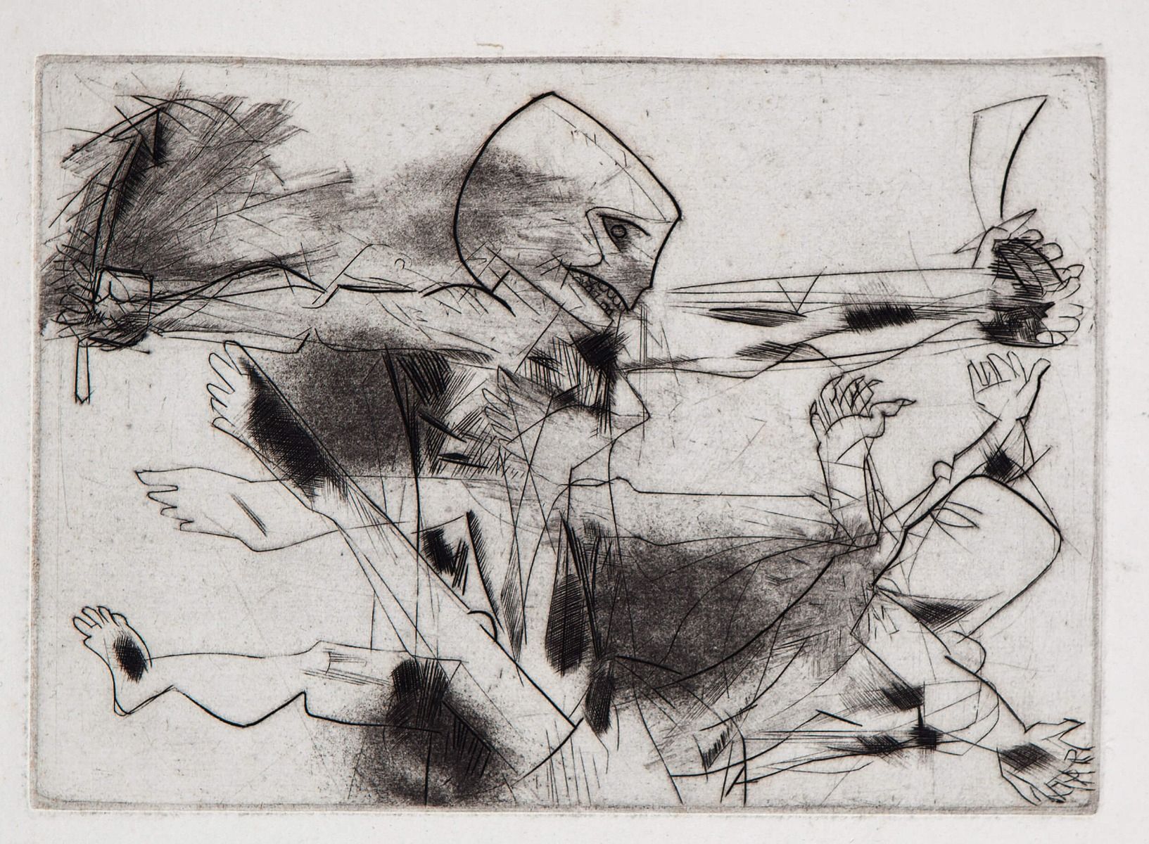 Studying briefly at the Government School of Art, Calcutta (now Kolkata), in the mid-1940s, Somnath Hore trained under the artist Zainul Abedin, and, later, Safiuddin Ahmed, the printmaker. A participatory, collective practice with fellow artists like Chittaprosad led to his intellectual growth. In a thirty-year teaching career, he set up the printmaking department of the Delhi Polytechnic of Art, and nurtured students at Kala Bhavana, Santiniketan, the fine arts department of Visva-Bharati University, established by the Nobel laureate Rabindranath Tagore. His etchings on handmade paper explored some of the traumas of those decades, when violence overwhelmed the imagination of political freedom. In this image, the act of violence entangles two bodies into an intimate encounter- so that we are hard-pressed to distinguish between the aggressor and the victim.