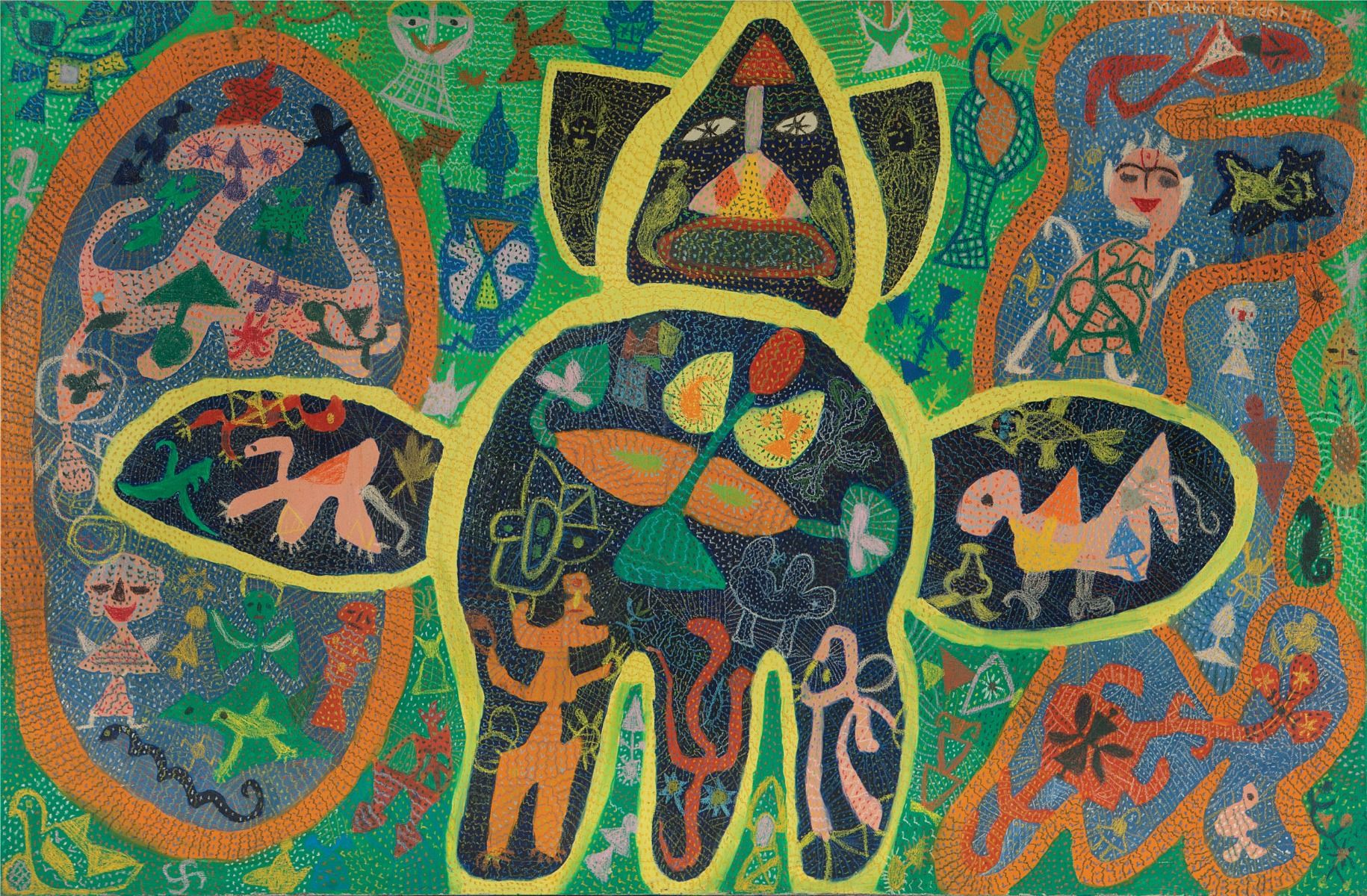 The showstoppers at the entrance of the DAG booth at the India Art Fair 2020 included a poignant painting of Draupadi’s saree being unfurled in the Kaurava court painted by M. V. Dhurandhar, alongside a work by an unknown artist in the style of the Early Bengal School—the oldest work on display. Together, they were a pointer to the masterpieces on display at the DAG booth, covering over roughly a century of art practice in India. DAG’s representation included some fine artworks such as a huge canvas by K. H. Ara, a ceramic sculpture by Mrinalini Mukherjee, a stunning canvas by Sohan Qadri, colourful abstract paintings by J. Swaminathan, Shanti Dave and G. R. Santosh, a masterful work by S. H. Raza, a lovely Jamini Roy, and paintings by M. F. Husain, Krishen Khanna, Paritosh Sen, J. Sultan Ali, Madhvi Parekh and others—each of unparalleled quality.