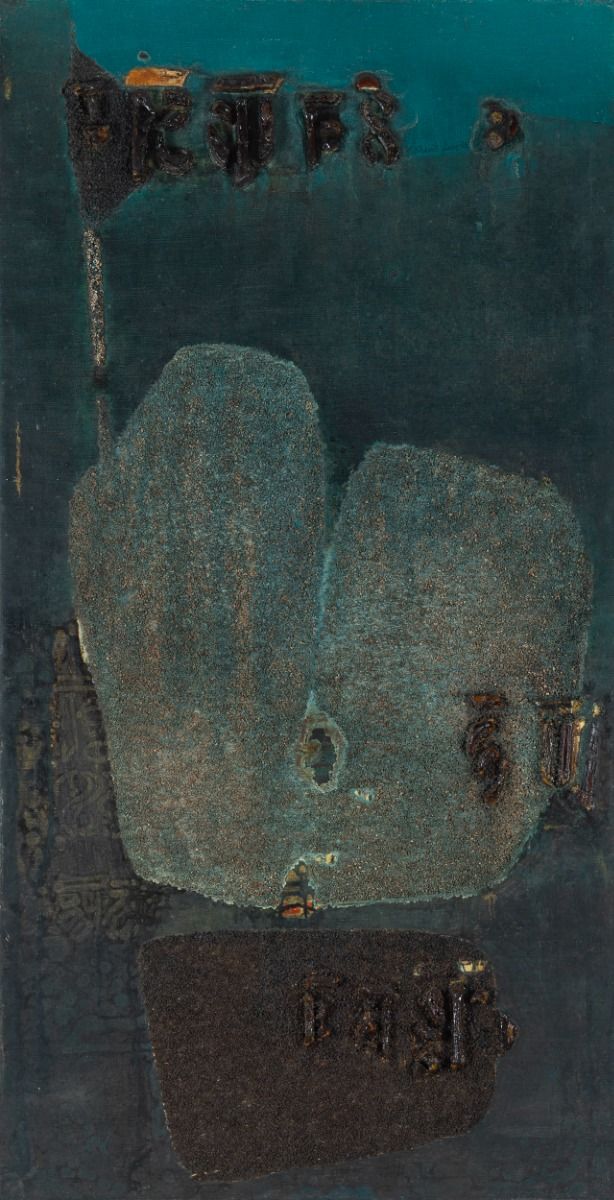 Oil, encaustic and gravel on canvas
