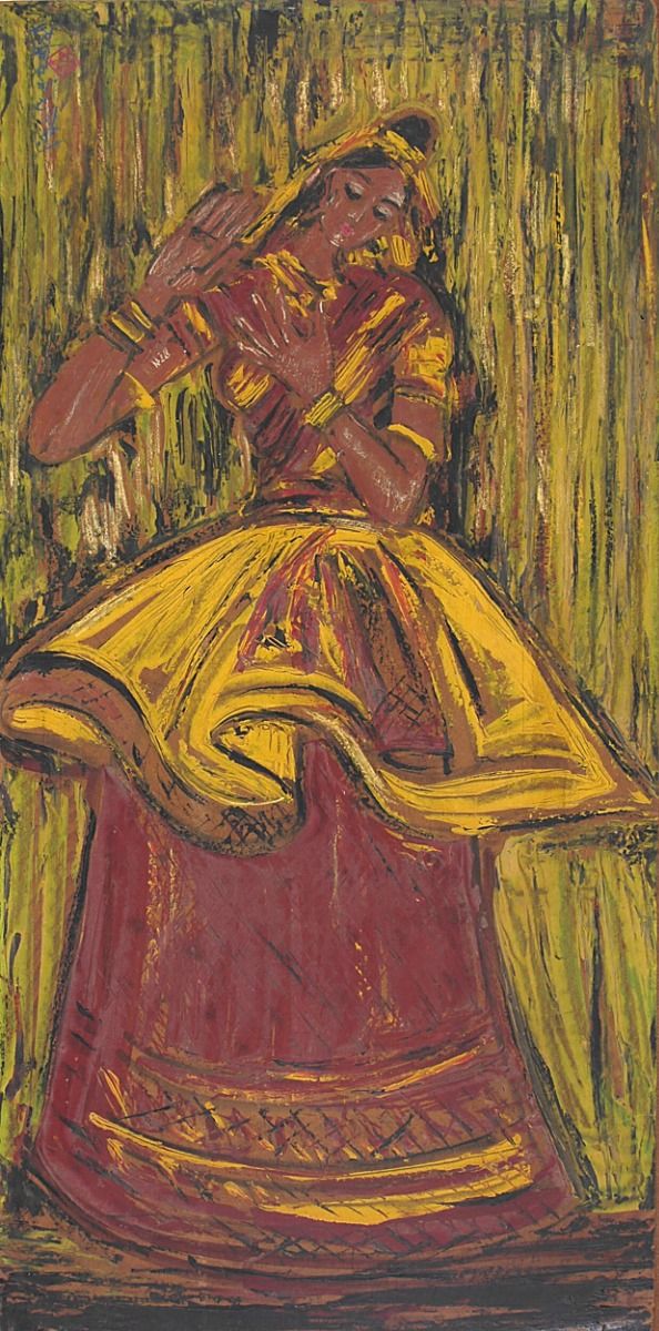 Originally from the Chittagong district of undivided Bengal, Sudhir Ranjan Khastgir studied fine art under Nandalal Bose in Kala Bhavana, Santiniketan. According to some art critics, he did several paintings of dancing figures in the 1950s—possibly because he directed some of Tagore’s dance-dramas—and could have sought inspiration for his paintings from them. Noted author Amit Chaudhuri, writing on Khastgir’s works, said, ‘In situating his art in the metaphor of performance, he seems almost unique among Indian painters of his time.’