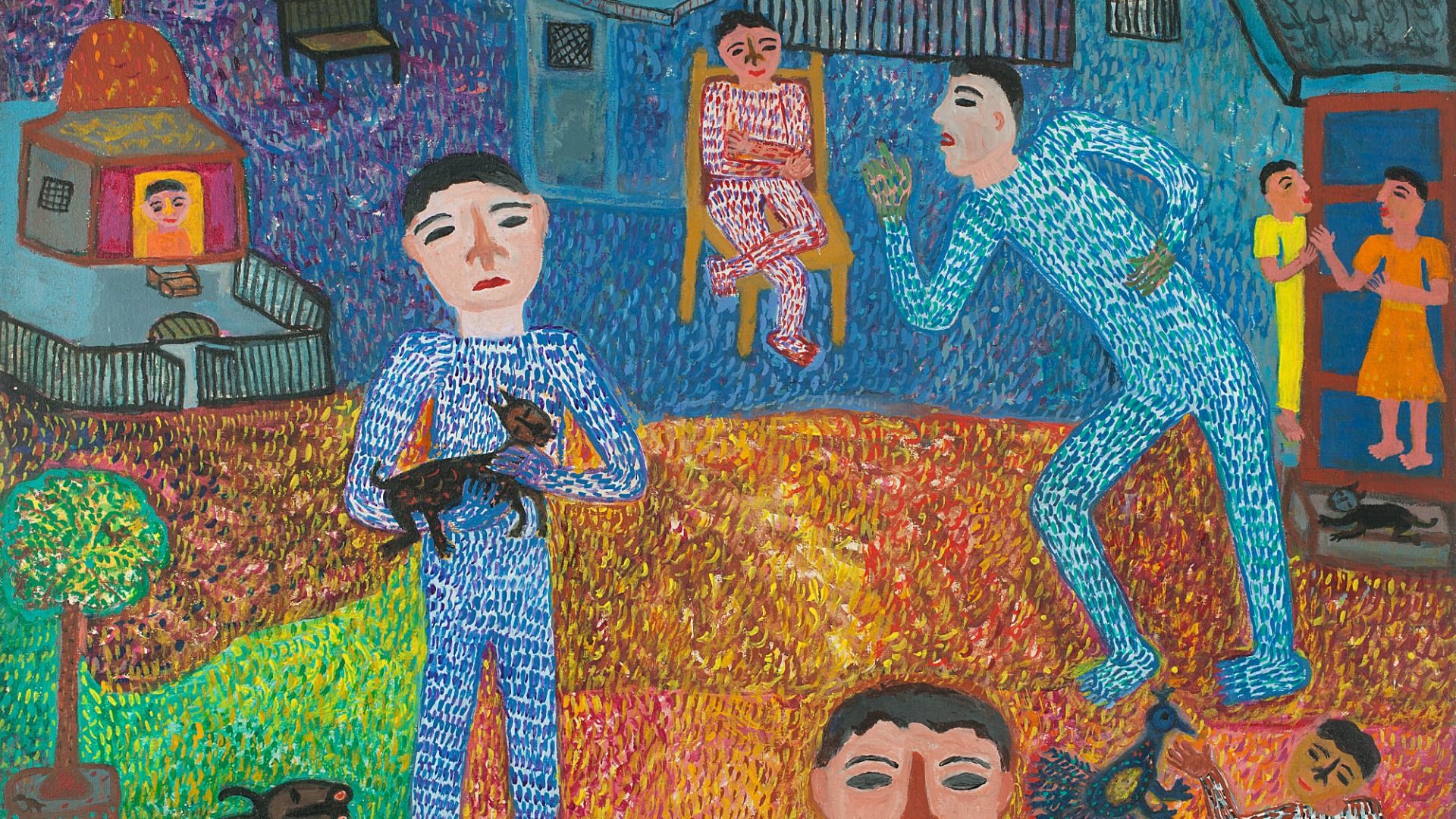 ‘Her early oil paintings remind one of children and adults as they move fearlessly in the jungle. They are not scared of the animals because the animals too move around like human beings’
