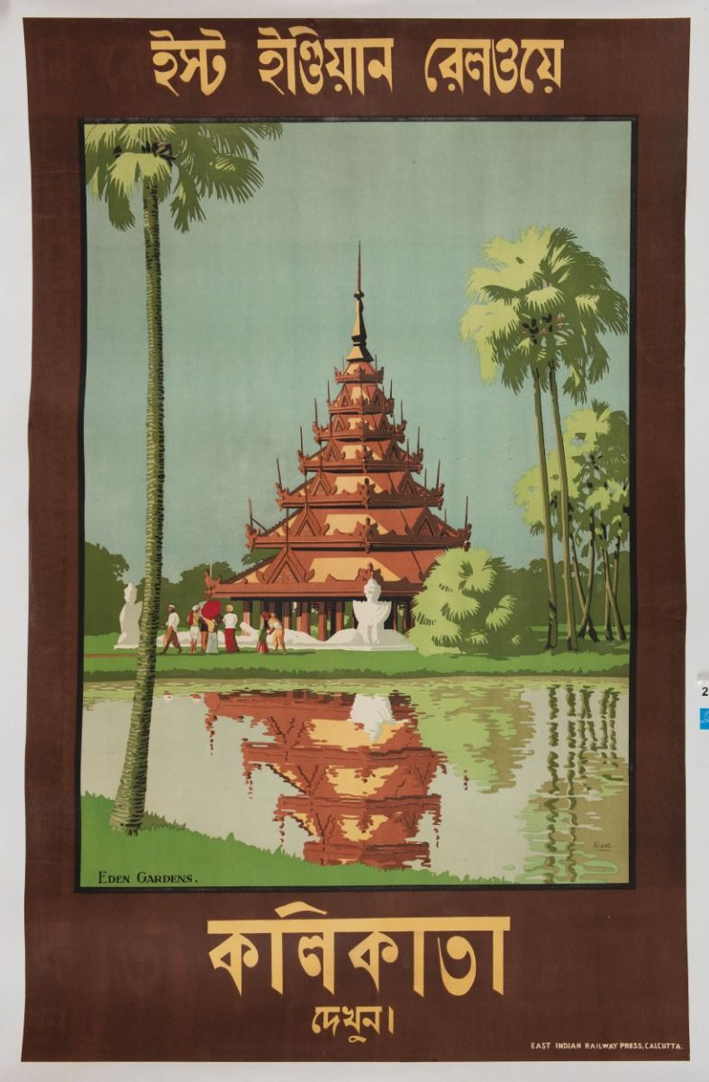 Although most identify the name ‘Eden Gardens’ with the iconic cricket stadium in Calcutta (now Kolkata), it was originally borrowed from an adjacent park housing a Buddhist pagoda, which can be seen in this poster published by the East India Railway Press. The garden, then called Auckland Circus Garden, was opened to the public in 1840, its construction supervised by Emily and Fanny Auckland, and their brother George Eden—who was the Governor-General of India during 1836-42. The Tazaung pagoda was originally built in Prome, Myanmar, and brought to Calcutta in 1854 by Lord Dalhousie, Governor-General of India from 1848 to 1856, after the second Anglo-Burmese War (1852-1853).
