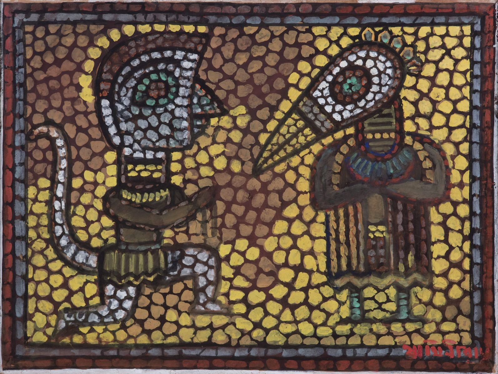 In his vast repertoire of distinctive art, Jamini Roy painted quite a few works in the Byzantine style, which he would have learnt about through books, or so believe the scholars. Some of those are on Christian themes. This one, however, is a rare example of Byzantine style being used to convey essentially Indian characters, Hanuman and Jatayu in this case, giving expression to an important episode from the Ramayana. The highlight of the work is the creation of the painting through a mosaic of uneven polygons that fill up the surface of the painting, a characteristic of Byzantine art.