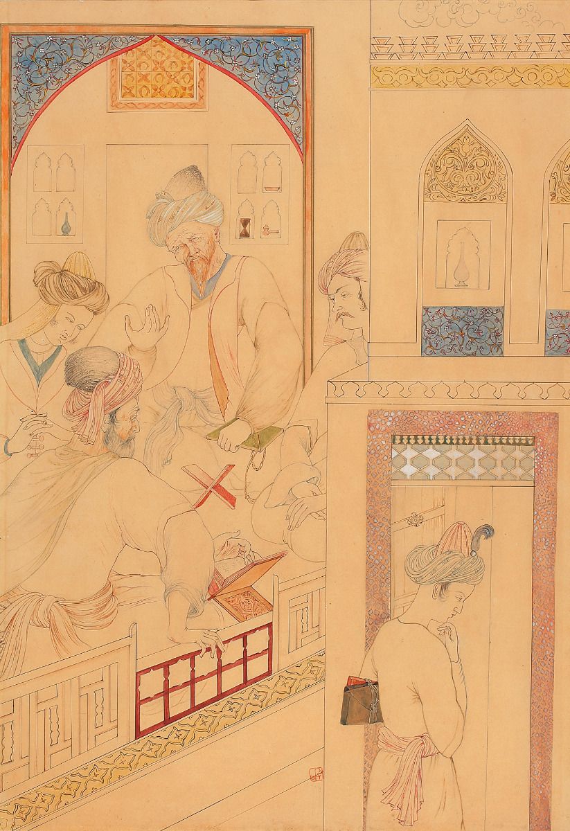 Untitled Asit Kumar Haldar Asit K. Haldar (1890—1964) was a major artist who worked across both the Bengal School as well as the Santiniketan environments, due to his affinity with the Tagore family. He is probably best remembered for his delicate wash paintings and illustrations of sacred literary texts, even though he made a large body of abstract works and ventured into cartooning and caricature as well. Although we hear more about the Hindu revivalism of the period he lived through, which informed nascent attitudes of Indian nationalism, ‘Persophilia’ (as Hamid Dabashi would put it) occupied another pan-subcontinental cultural complex whereby older political and emotional contexts of Persian resistance to Arab conquest was transmuted into an allegory of Indian colonial resistance in the face of political overlordship by a foreign rule. The Rubaiyat of Omar Khayyam was presented by its translators like Edward FitzGerald as such a document of resistance by Persians against the orthodoxies of Sufism and Arab spiritual hegemony, even though scholars have argued against such essentialization since. |