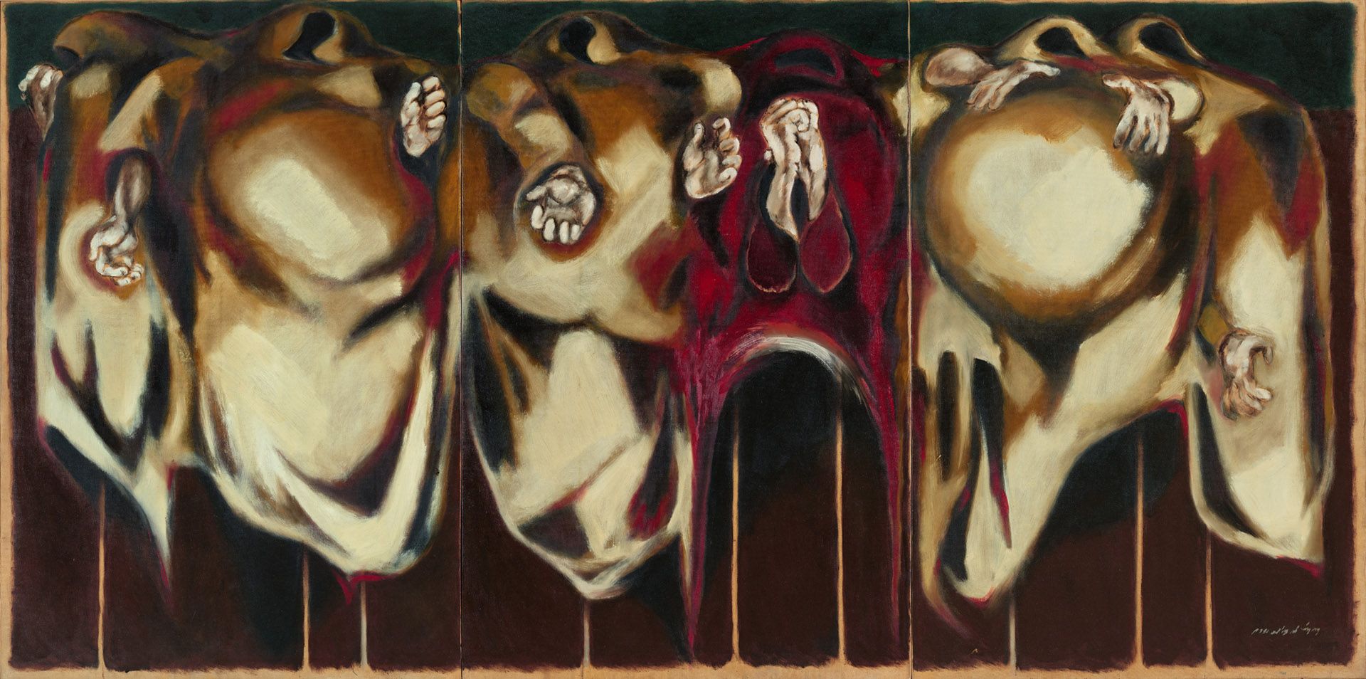 GESTURES (TRIPTYCH),1966 A. Ramachandran ‘There is something immensely ludicrous about the fat friar-like figures arranged to devote feigned dignity, lewd beckoning, and a gesture of prayer. Yet these are not flesh and blood figures, we see, on closer examination. They could be dummies, great inflated things that are tethered to white cords, the white lines that break up the bottom of the composition so effectively. There are, therefore, two themes here: (1) the shallowness of religious life as practiced by the priests, and (2) the shallowness of the superficial vision of people who even if they read this theme right, are carried off by their own associations. We are not quite sure who the painter is laughing at’. – Richard Bartholomew |
