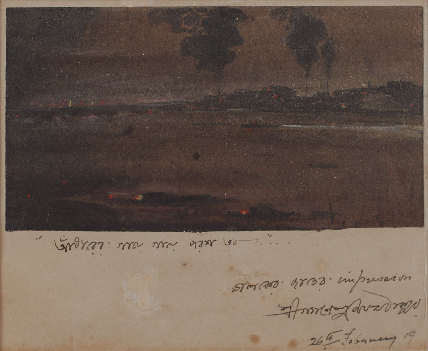 Gaganendranath Tagore attempted to represent visual experiences on to his painted surfaces, either directly from nature as he saw it or from memory. In his representations, he was aided by his preferred technique of Japanese brushwork. In this postcard, he paints an expanse of darkness. Grim reminders of industrial modernity stretch along the horizon as tall factory chimneys release columns of smoke into the night sky. Some flickering specks of light appear in the foreground, in the distance, and below the painting, which reminds him of Rabindranath Tagore’s words, ‘Even the darkness bears the signs of your divine touch.’