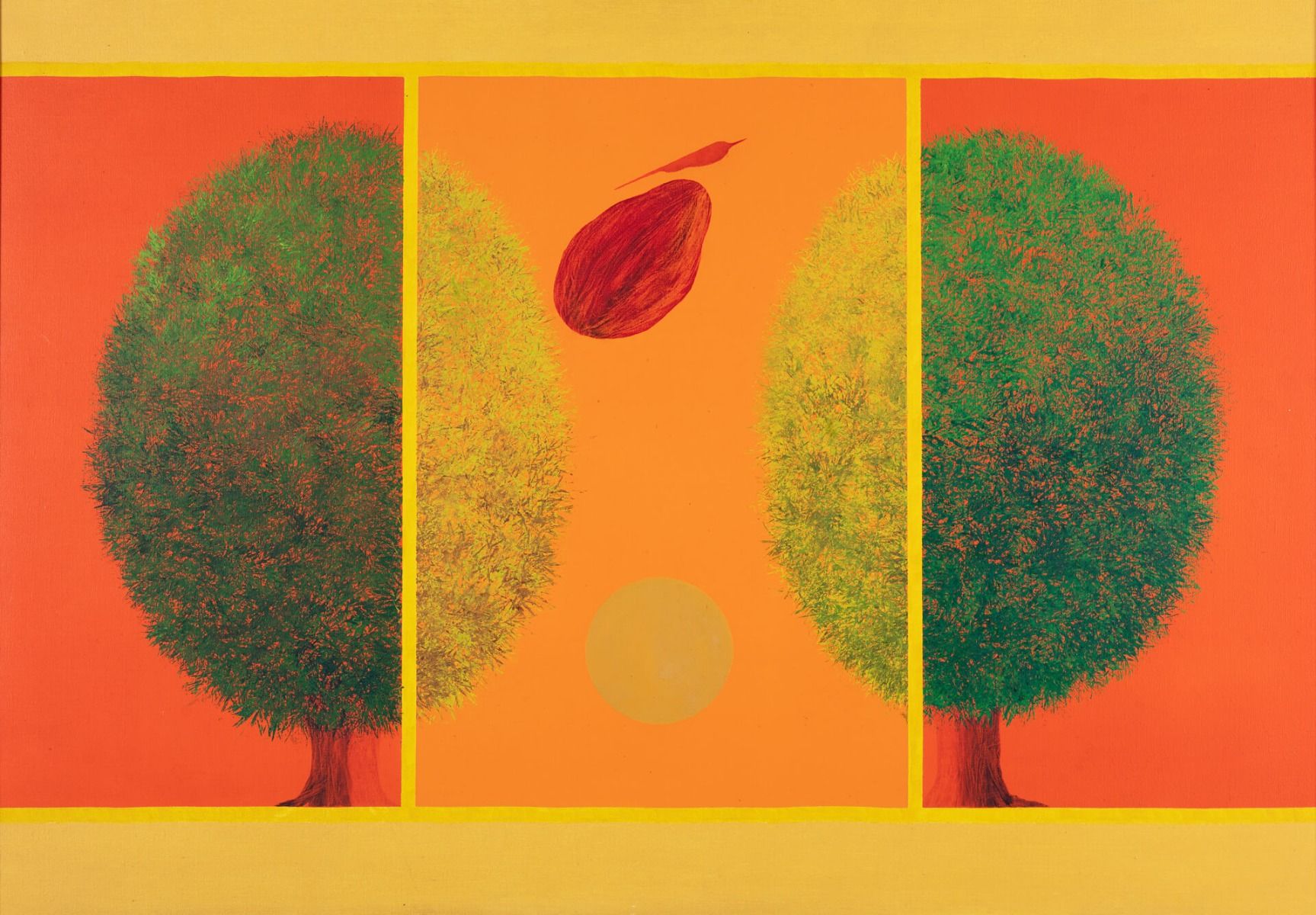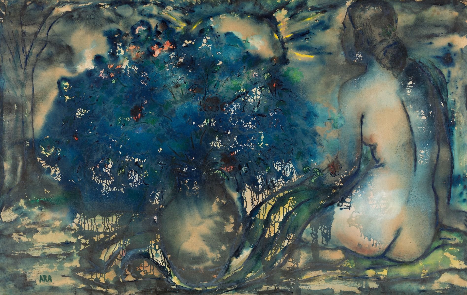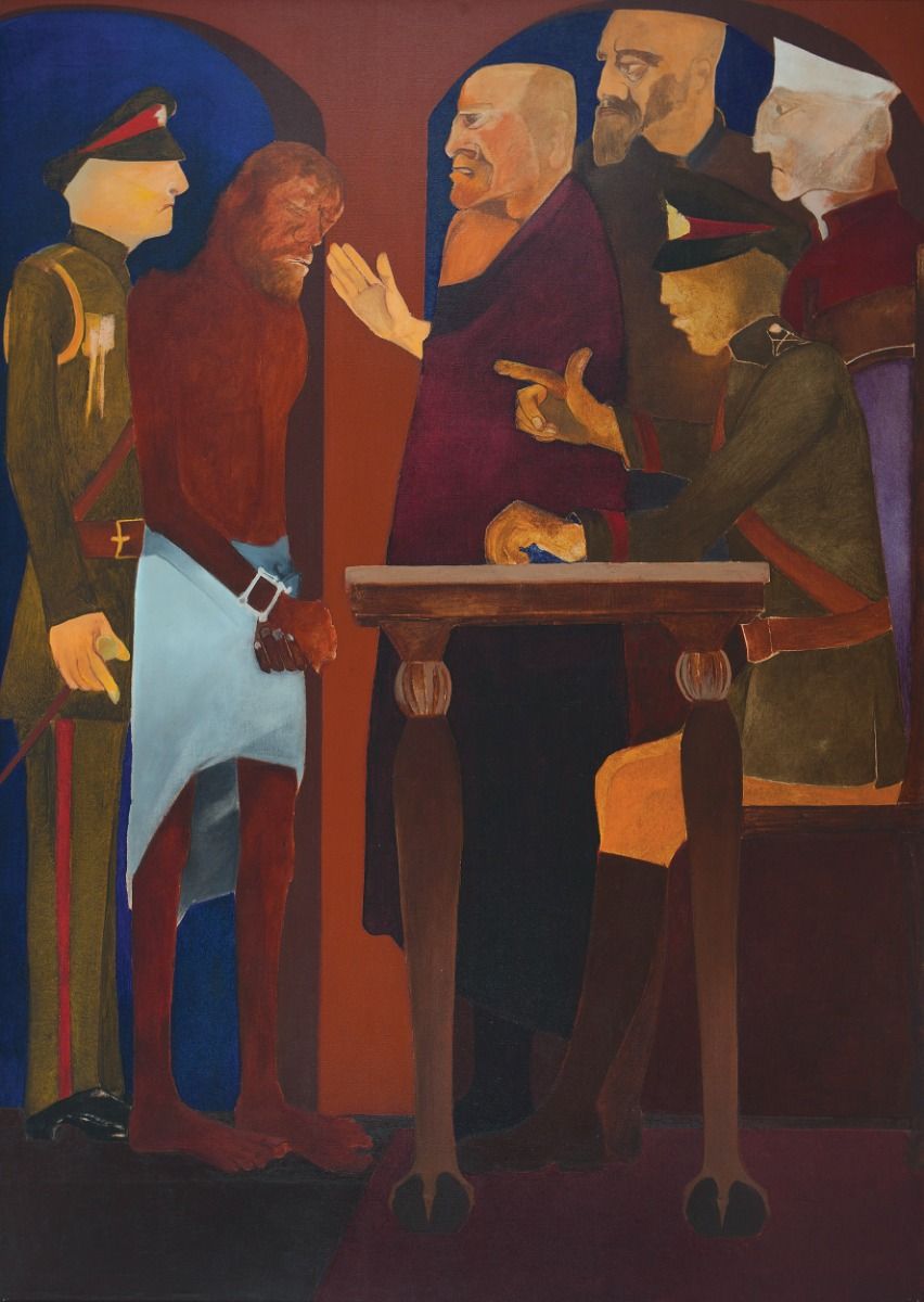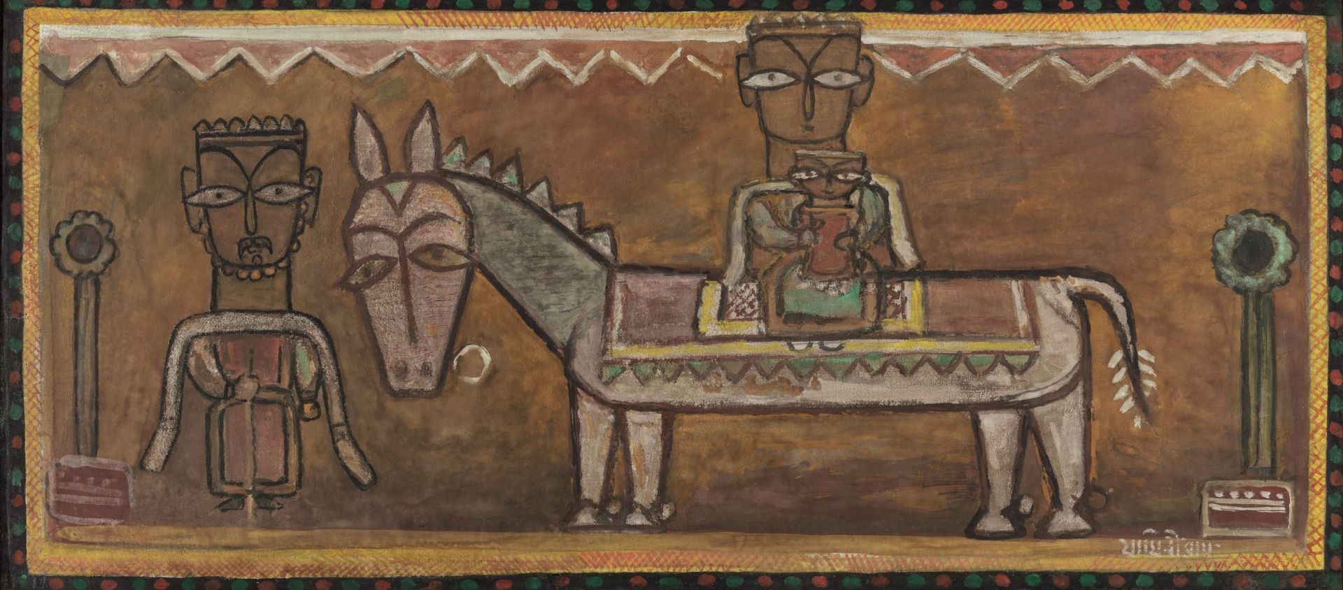 The showstoppers at the entrance of the DAG booth at the India Art Fair 2020 included a poignant painting of Draupadi’s saree being unfurled in the Kaurava court painted by M. V. Dhurandhar, alongside a work by an unknown artist in the style of the Early Bengal School—the oldest work on display. Together, they were a pointer to the masterpieces on display at the DAG booth, covering over roughly a century of art practice in India. DAG’s representation included some fine artworks such as a huge canvas by K. H. Ara, a ceramic sculpture by Mrinalini Mukherjee, a stunning canvas by Sohan Qadri, colourful abstract paintings by J. Swaminathan, Shanti Dave and G. R. Santosh, a masterful work by S. H. Raza, a lovely Jamini Roy, and paintings by M. F. Husain, Krishen Khanna, Paritosh Sen, J. Sultan Ali, Madhvi Parekh and others—each of unparalleled quality.