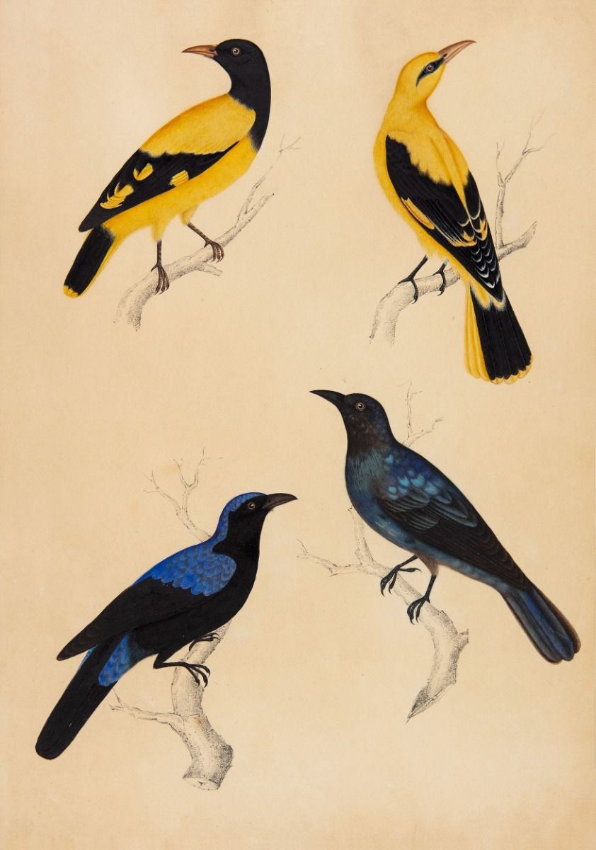 Black-hooded Oriole (Oriolus xanthornus), Indian Golden Oriole (Oriolus oriolus) and Asian Fairy Bluebird (Irena puella)