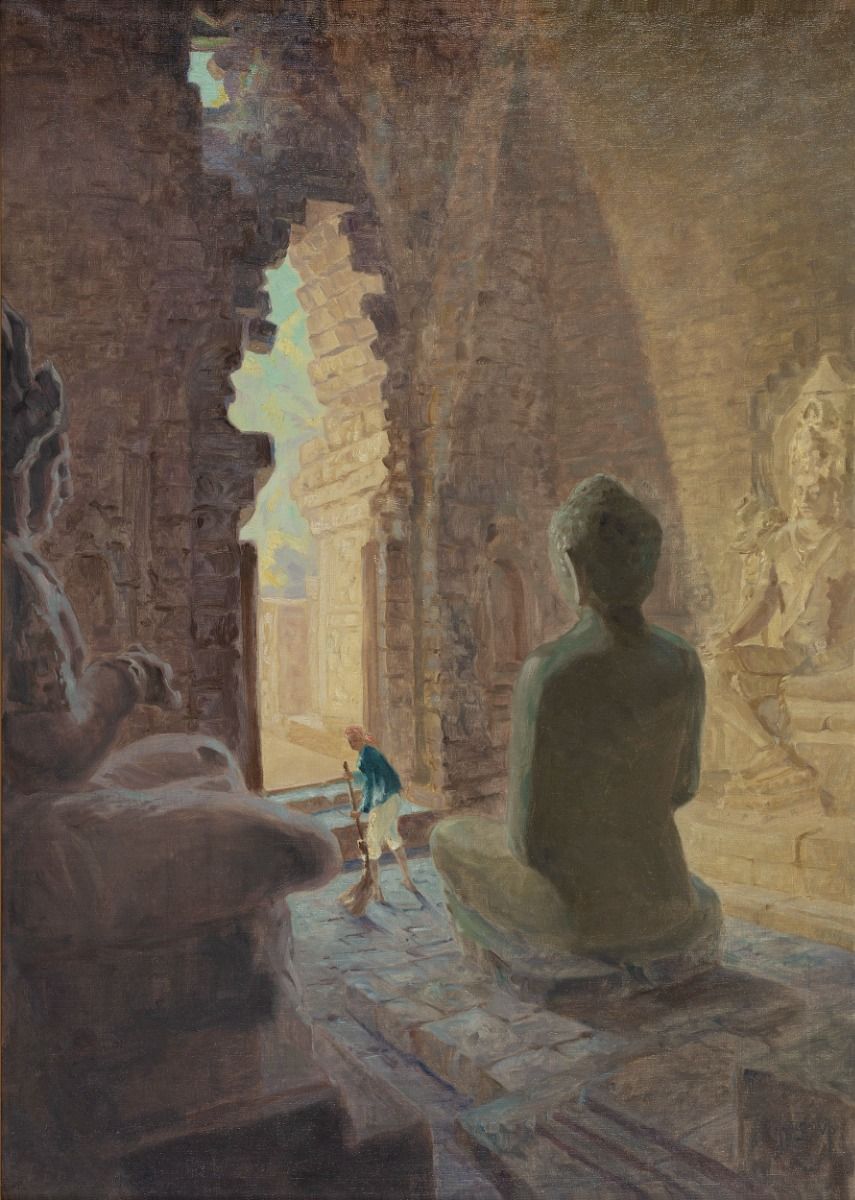 A Man Sweeping in a Temple