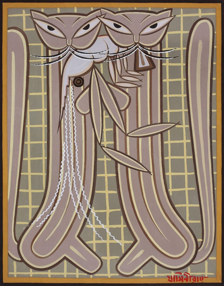 Jamini Roy remains one of the most easily recognised artists of the country because of his distinctive signature style that bordered on the folk. Roy epitomised the restlessness among his generation of Indian artists wanting to break free of their European academic training and its overwhelming influence, to create a truly Indian syntax for modern art. He turned to the patua artists of Bengal, including those of Kalighat, to develop a stylisation and a narrative that captured the earthiness of the characters in his art. In this work, he presents two cats—playful yet competitive—fighting for a lobster that they both want to claim.